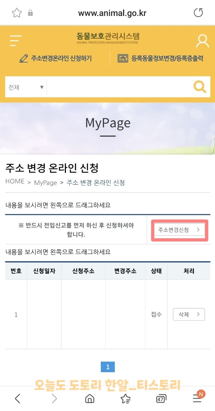 "주소변경신청" 버튼을 클릭해서 들어간다.