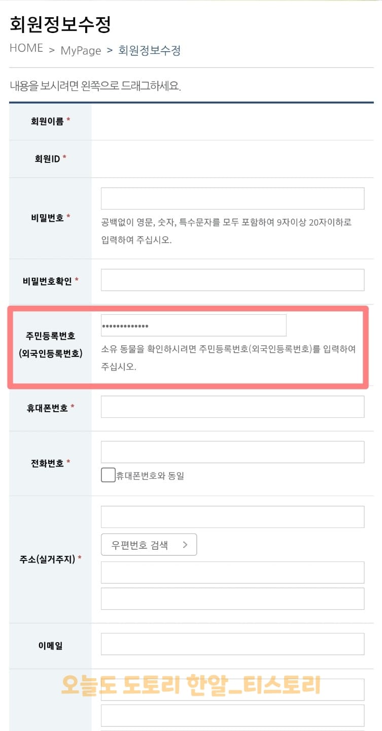 정보수정 화면에서 주민등록번호 칸에 본인의 주민등록번호를 넣는다.