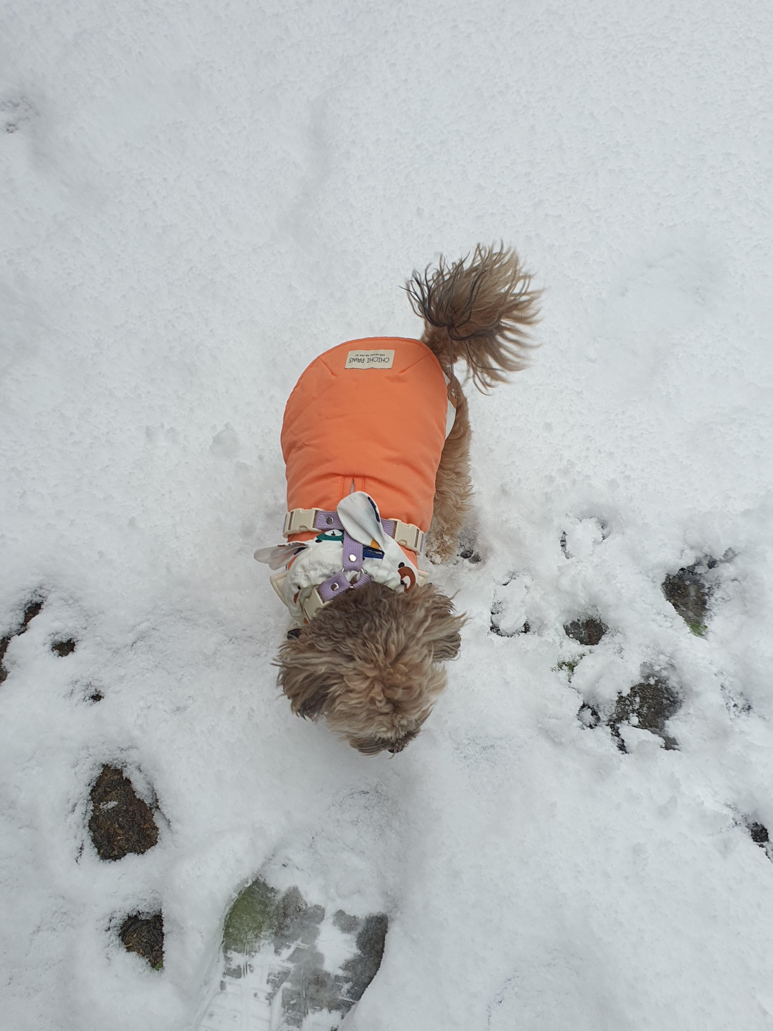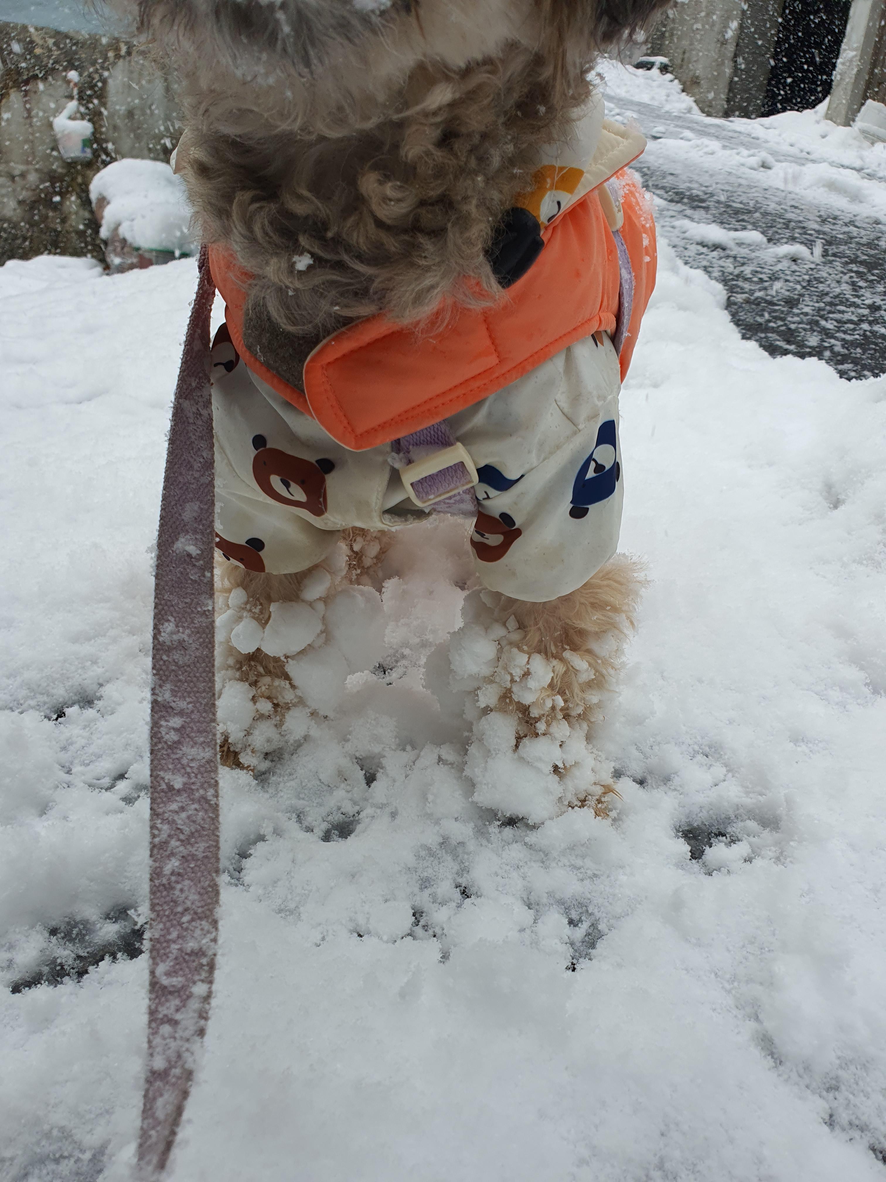 점심 먹고 눈이 조금 내리고 있길래, 얼른 토리한테 우비와 패딩조끼를 입혀서 동네 산책을 나갔다